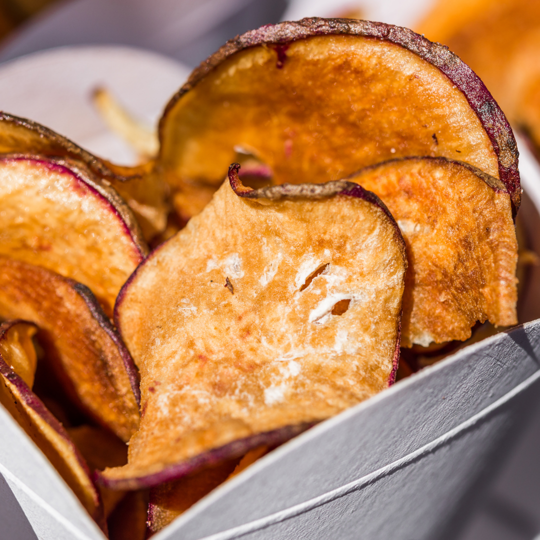 Looking for a simple and delicious snack? The sweet and salty combination of roasted sweet potato chips is the perfect transition from processed "Lays" chips to plant based whole foods for a healthy snack. A good source of VitaminA and beta-carotene for healthy skin and vision, and fiber important to regulate digestion and keep you feeling full until your next meal.